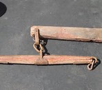 The “tugs” were thick leather straps attached to the hames and collar and running back on both sides of the horse. A length of chain is attached to each end of the tug strap. The chain is used to hitch the horse to a singletree. The singletree is a wooden 3 to 4 foot piece to which the tugs of the horse harness are fasted. The center of the singletree is attached to a doubletree.