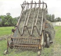 Dad had a wooden hay loader in my early years on the farm. Later, he bought a lighter metal New Idea hay loader. What an exquisite piece of equipment. Standing about 10 feet off the ground and about 6 feet wide, the horses straddled the windrow of hay. The big wheels of the hay loader drove the mechanical parts. A wheel driven chain on the left side turned the rotary rake, and drove 6 rows of tines, 3 offset from the other 3, that raised the hay up a sloping chute and into the hay wagon.