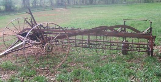 Our McC-D rake had 2 large 3-4 foot steel wheels in front, 4 bars of tines that spun on a reel that was at an angle to direction of travel. The tumbling tines would gently kick and roll the hay into straight narrow rows, ready for the hay wagon and hay loader. A smaller caster wheel turned in the back. The driver saw up quite high, unlike the hay mower. I like raking hay. I had a good view, breeze blowing, straw hat to keep the sun off, the wonderful smell of cured hay. Horses, whether mowing or raking, moved at about 2 to 2 ½ miles per hour.