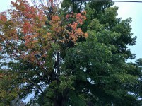 The days are getting shorter. It was dark at a little past 7 PM last night. The big maple across from our house is turning color. The leaves on the left have turned to yellows and oranges. The right-hand side remains green. It different each year.