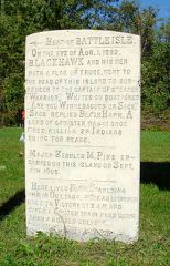 HEAD OF BATTLE ISLE. ON THE EVE OF AUG. 1, 1832, BLACKHAWK AND HIS MEN WITH A FLAG OF TRUCE WENT TO THE HEAD OF THIS ISLAND TO SURRENDER TO THE CAPTAIN OF STEAMER WARRIOR. WHITES ON BOAT ASKED ARE YOU WINNEBAGO OR SACS? SACS REPLIED BLACKHAWK. A LOAD OF CANISTER WAS AT ONCE FIRED, KILLING 28 INDIANS SUING FOR PEACE.